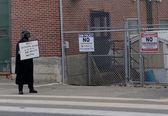 Darth Vader made a personal appearance at Bath Iron Works in Maine during a shift change vigil on last day of Keep Space 4 Peace Week.