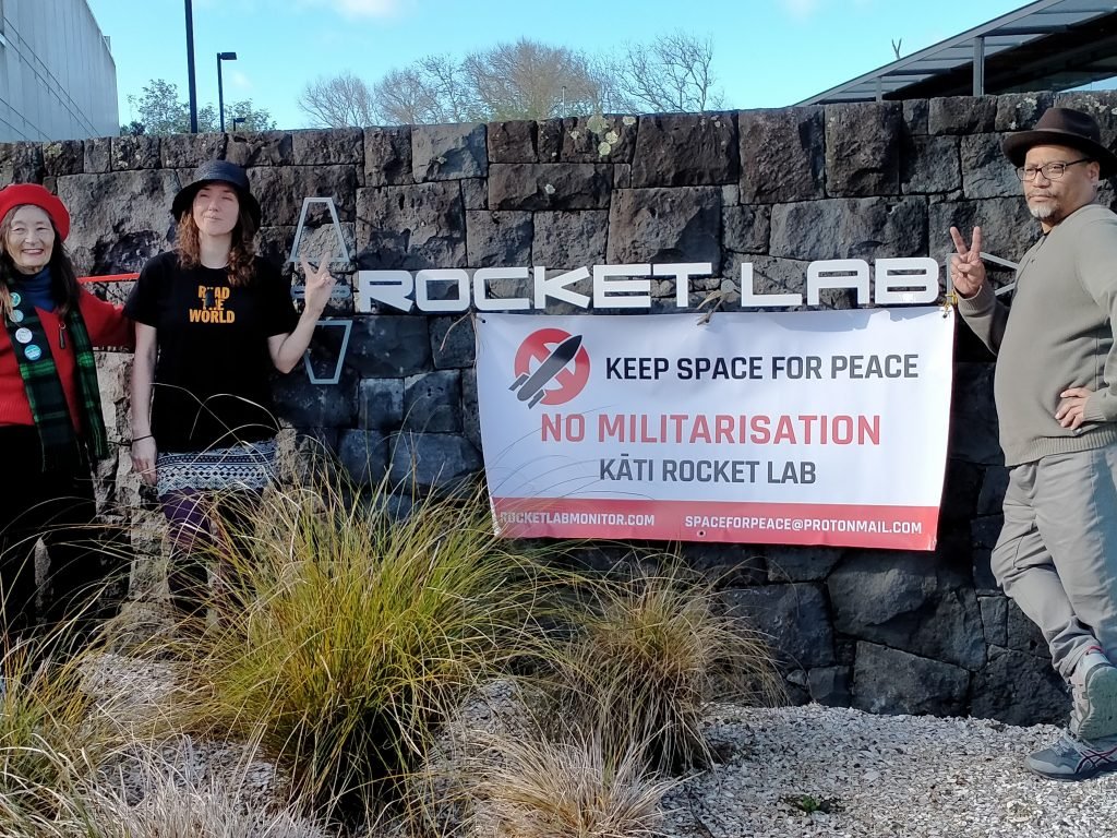 ‘STOP MIlitarisation of Space’ banner outside Rocket Lab HQ Auckland New Zealand, 21 June 2021. Laurie Ross-Coordinator of the ‘Space for Peace Aotearoa’ event, with Eliana Darroch of ‘Auckland Peace Action’ newsletter, plus the Green Party MPTeanau Tuiono, who tabled the OSHAA Prohibition of Military Hardware Payloads-Amendment Bill in parliament.