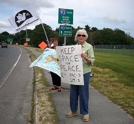 Following the vigil we had a supper at the Unitarian Church in Andover and heard speeches by John Schuchardt from the co-sponsoring North Shore Coalition for Peace & Justice. Art Brien also spoke and received a standing ovation from those in attendance. Local activist Mary Kate Small sang peace songs and then GN board member Loring Wirbel from Colorado Springs gave us more information about Raytheon’s key role in moving the arms race into space.