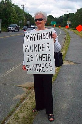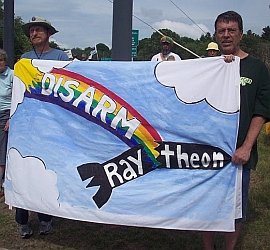 These systems are now being deployed surrounding Russia and China Our 19th annual space organizing conference, entitled Raytheon, Missile Offense, & Endless War: Working Together to Demilitarize and Create a Sustainable Future, began on Friday, June 17 with a 1½ hour afternoon vigil outside the gates of Raytheon in Andover, Massachusetts. Over 65 people joined us at the gates as the workers poured out of Raytheon in their cars. Luckily the rain did not pour down upon us as we stood under threatening skies. It is known that 4,500 people work at the Andover facility where they build “missile defense” systems like the PAC-3 (ground-based launchers) and SM-3 (Aegis destroyer based) interceptor missiles that are now being deployed near the borders of Russia and China. Conference