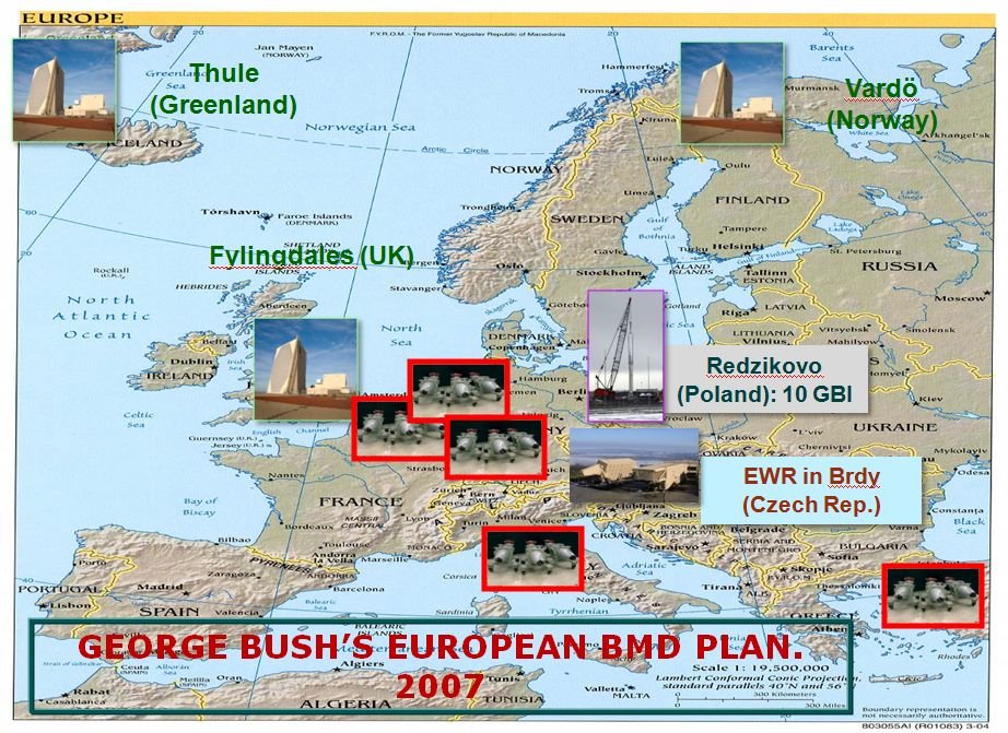The US projects its military power globally through over 800 foreign military bases, most of which are linked by space technology, to exert a massive grip around the world and the US military divides the world into sectors which it seeks to command and control. It uses 6 geographic and 4 functional combatant commands - re coordianted through Strategi Command (STRATCOM) from Offutt Air Force Base in Nebraska. It is STRATCOM that is charged with the mission of Integrated Missile Defense. T he US missile defence system currently come in two parts - the Ground based Mid Course Defense (GMD) system of George W Bush and the Barak Obama's European system.