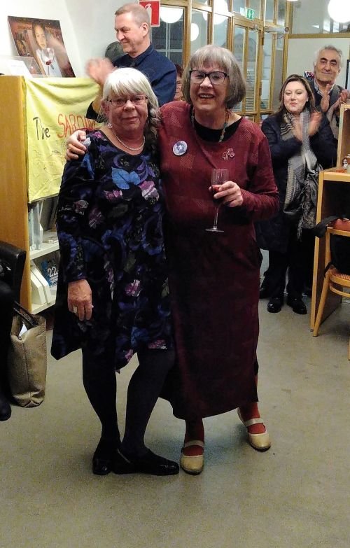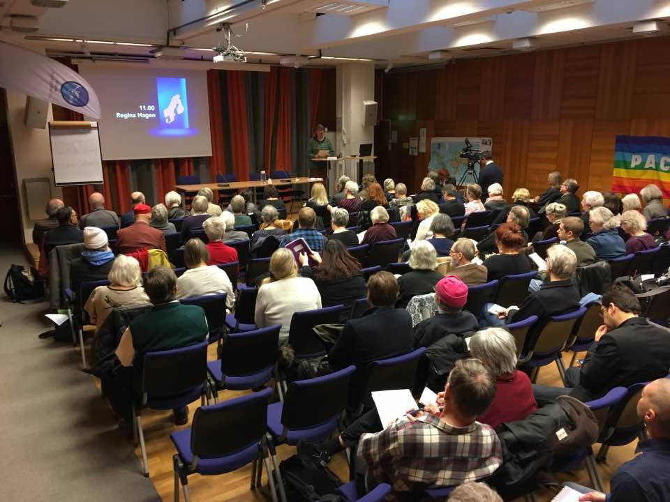 If the audience today was any indication there is a strong interest in our analysis about US-NATO use of space technology to prepare for war with Russia (and China). More than 80 activist leaders turned out from all over Sweden, Finland, Denmark, and Norway to hear us. After the conference there was a party at The Solidarity House to celebrate the day and Agneta's birthday!