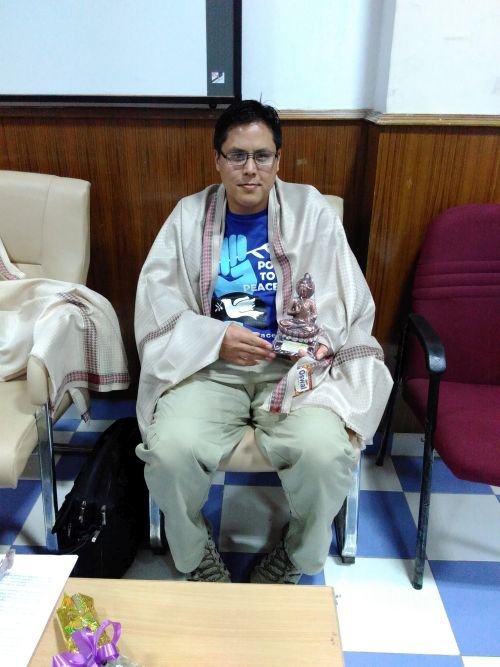 time. Let us accept all the people of the world." While at the University we were introduced to Prof. Dr. Madhab Prasad Gautam, the Campus Chief of Patan Multiple Campus. After hearing reports on our meeting with faculty members, he organised another meeting for us to speak at and invited all faculty members and students to attend.