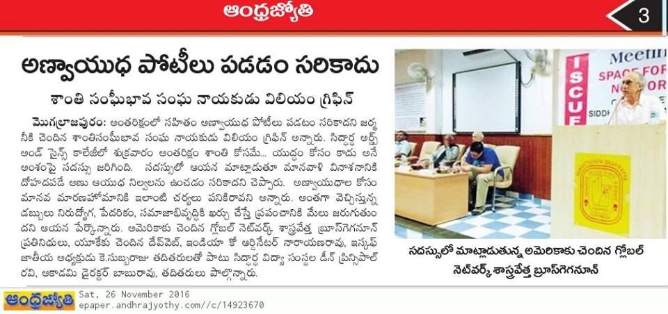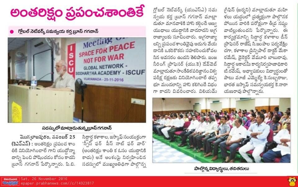 Early the next morning we took a train ride south for about six-hours or so to our next port of call - Vijayawada. Here we were hosted by the Indian Society for Cultural Co-operation and Friendship (ISCUF) who organised a meeting on "Space for Peace Not for War" in conjunction with Parvathaneni Brahmayya Siddhartha College of Art & Science, where we were introduced to Prof Rajesh Jampala, Dean of the college.