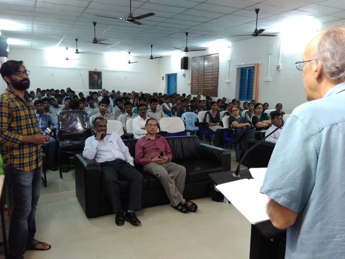 Monday, November 21 2016Reaching More Students in Visakhapatnam After the conference at GITAM, four of us stayed on in Visakhapatnam for more talks and visits. Our extra 2 day programme in Visakhapatnam was organised by our griend and colleague J.V. Prabhakar, a retired engineering school administrator who heads the Visakhapatnam chapter of the Global Network. Prabhakar works closely with J. Narayana Rao and has been to several of our past GN conferences in different countries. Prabhakar is widely respected in his community and he often introduced as at the various venues he had a connection with. On the 21st we visited the Dr. V.S. Krishna Government Degree College established in 1968. Here we met with the staff, including and over 100 students heard our talks. Following this we visited a private school which offered more educational opportunities for the children of parents with a higher income. Again more than 100 students listened to each of us speak.