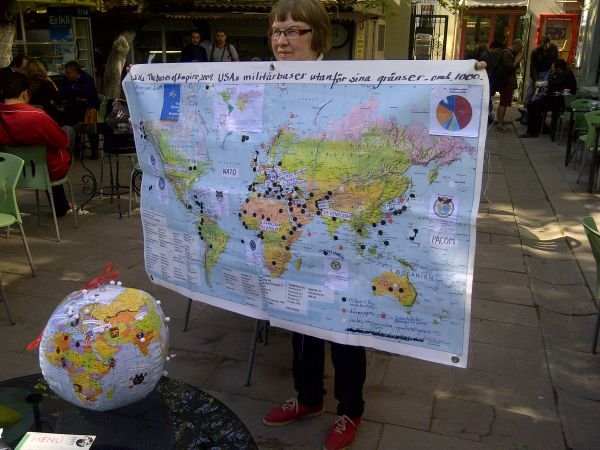 We (Dave Webb and Agneta Norberg) attended the Peace Conference on behalf of the Global Network, although unfortunately we couldn’t extend our stay to Antioch. In Istanbul we met with representatives of peace-organizations from many parts of the world who were gathering to protest against the imperialist war in Syria and declare the solidarity with the Syrian people. We were greeted at the airport on the European side of the city by a group of very helpful young people who took us to the Nazim Hikmet Cultural Centre, named after a world famous Turkish poet and author. This was on the Asian side of the city and so we needed a ferry journey across the Bosphorus to get there. That evening we mixed with our hosts - Aydemir Güler of the Peace Association of Turkey; Socorro Gomez, President of the World Peace Council and Aqel Taqaz, regional coordinator of the WPC and also from the Palestine Peace Committee – and the other guests and friends at a press reception in the grounds of the building. Agneta immediately demonstrated her 3-D teaching tools (her world map and globe showing key US bases!) Wherever we went we were greeted with typical Turkish hospitality – including impressive varieties of food and drink.