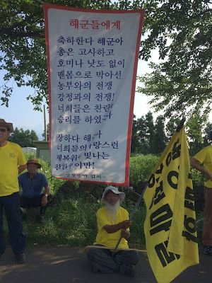 We walked 11.5 miles today in the high heat and the hot top (what Boston folks call the asphalt) only made it worse – sort of like walking for six hours through a steam room. Everyone was sweating but it was remarkable to see our large group stay together the whole way – especially so because many families came from the Korean mainland and brought their small children and they walked the entire way. The food was prepared by teams of volunteers back in Gangjeong village and trucked out to us for lunch and dinner. During breaks and lunch the iconic Catholic priest Fr. Mun joined us hobbling around with his cane but still inspiring people as he as done in virtually every progressive movement in South Korea for many, many years.