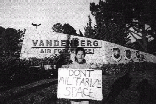 ![]() Since I arrived in California I've been extremely busy and it has proven to be a good trip. I began in Oakland and met with Andy Lichterman from the Western States Legal Foundation that does work around DOE facilities and they are active in Abolition 2000. We spent several hours discussing the links between the technology development programs at DOE and he assures me that all the latest technologies developed for nuclear weapons are "dual" technologies that will be used in space weapons. I invited him to speak at our April, 2000 conference in DC on the subject. I drove south to Vandenberg from Oakland and spent the day before our protest doing alot of media calls and I visited the base with my local host Bud Boothe. At the base we discovered that the Air Force has created a caged area that they wanted our protest to be in on 9/25 so we had to explain to them that we were not stupid and knew that we had the right to protest in front of the main gate. We had the ACLU call them from Los Angeles and when we arrived for the demo on 9/25 the fenced area had been removed and we had no further problems from them. The day before the protest we had four articles in newspapers in the region and one of them in Lompoc (the town nearest the base) had printed my letter to the base commander which detailed our reason for being here and our call for base personnel to "lay down your missiles." We also discovered that the base paper had a front page warning to base personnel about the demo which was a help in creating discussion on the base. I really believe in this kind of activity because this is how I learned of the peace movement while being in the Air Force during the Vietnam War and seeing the impact of small demonstrations at the base I was stationed at in California during that period. On the day of the demo we had 60 folks come from as far away as Los Angeles north to San Luis Obispo. So we got great support from the whole region around the base and beyond. The demo went well (vigiling and speakers) and when it was over a delegation of us took my letter to the commander, which by now had been signed by all present, and asked to see the commander. They said he was not available but that we could give it to a Col. Lamb if we wished. So they called him on the phone and soon enough he arrived. I looked him in the eye and explained it all for him and asked him to tell his boss to send the letter to his bosses in Washington DC. He said that he would do so. We got extensive coverage of the demo on TV (first story on all three local stations) and good stories in the three pepers in the region the next day. I had brought along the Darth Vader costume which a local man wore for the entire demo holding a sign that read "No weapons in space" and that image was the primary visual that came across on TV and in the newspaper. Since then I've done another newspaper interview with a weekly in Santa Barbara and two radio shows. One of them invited me to write a 90-second editorial which they had me come into the studio and tape and they will broadcast it twice. While in their lobby I noticed that the station had been voted the best radio station in Santa Barbara by readers of the local newspaper in 1997. On 9/29 we will go back to the base for a early morning vigil from 7-9 am. Folks from the Catholic Worker House in Los Angeles who could not make the 9/25 demo will come and join with us. After that I'll head home. The test had originally been planned for 9/29 but was changed to 10/2. We feel quite certain that they postponed it due to our presence at the base. The best thing is that my expenses for the trip have only cost $500 (airfare and car rental). A local person gave me a check for the GN in the amount of $500 so this whole thing cost us very little. I can assure you that local activists are very grateful that we have done this and the cooperation has been wonderful. People from different cities who haven't met before have now and I hope that they will continue to protest the BMD system at Vandenberg in the near future. One thing I have been telling everyone is that I read in "Aviation Week & Space Technology" last week that the Air Force is moving quickly on space based lasers that they hope to deploy soon after they get the go-ahead to deploy the BMD system. It is my belief that the so-called "defensive" BMD system is really intended to get the foot in the door, and then they bring on-line the other technologies that will surely be "offensive" in nature. I've been handing out copies of the Space Command's "Vision for 2020" to all the media I meet and I'm sure to point out the picture in the back of a space based laser firing at a target on earth. I do hope that people worldwide will pick up the pace on resistance to Star Wars as we move closer to the June, 2000 date where Clinton is expected to give the go-head for early deployment. Please help us build the pressure. I conclude my suggesting that the GN consider holding one of our future meetings in this region. The level of space warfare work going on in southern California is staggering.
