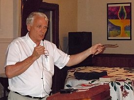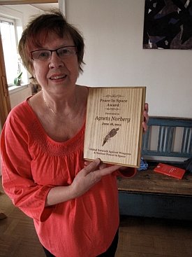On the evening of June 18 a second conference dinner was held at another Unitarian Church – this time in North Andover. War Resisters League/New England leaders Joanne Sheehan and Rick Gaumer cooked both of our dinners during the conference. It was wonderful having them with us and their good cooking was much appreciated by all. Two Peace in Space awards were presented after dinner to long-time GN board member Agneta Norberg (Sweden) and to the Merrimack Valley People for Peace. Art Brien accepted the award on his group’s behalf. GN chairperson Dave Webb (England) surprised all of us by presenting me with a Peace in Space award as well.