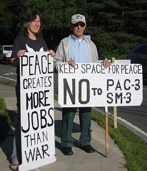 These systems are now being deployed surrounding Russia and China Our 19th annual space organizing conference, entitled Raytheon, Missile Offense, & Endless War: Working Together to Demilitarize and Create a Sustainable Future, began on Friday, June 17 with a 1½ hour afternoon vigil outside the gates of Raytheon in Andover, Massachusetts. Over 65 people joined us at the gates as the workers poured out of Raytheon in their cars. Luckily the rain did not pour down upon us as we stood under threatening skies. It is known that 4,500 people work at the Andover facility where they build “missile defense” systems like the PAC-3 (ground-based launchers) and SM-3 (Aegis destroyer based) interceptor missiles that are now being deployed near the borders of Russia and China. Conference