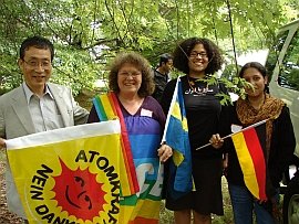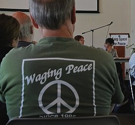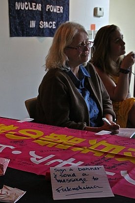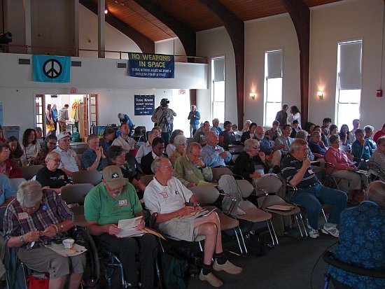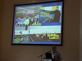 Loring Wirbel (Citizens for Peace in Space, Colorado Springs) has created a page on YouTube for videos he made of many speakers at the conference. You can see them here Jim Haber has put his images on flickr HERE More photos taken by Marian Stanton HERE And some by Nicole Moreau HERE Global Network 19th Annual Conference Joint Declaration At a time when the Obama Administration would like to stress its adherence to a more multilateral National Space Policy, the members of Global Network Against Weapons & Nuclear Power in Space remind us that the real global situation in space militarization should still be disturbing, when we see the real-world plans of the U.S., its NATO allies, and industrial nations worldwide. Even as the four years of an unprecedented recession have cut into commercial space enterprises, military budgets continue unabated, and are approaching $1 trillion annually in the U.S. The knee-jerk air-assault responses to the Libya crisis, followed by the SEAL assault on the Bin Laden compound in Pakistan, show that even as citizens of the Middle East and Maghreb nations rise in largely nonviolent campaigns for change, the U.S. and its NATO allies respond with integrated air, sea, and ground assault campaigns that use the theaters of space in virtually every aspect of military strategy. Global Network points out that, even as concern about long-range missile-defense networks in some regions has abated, the U.S., NATO, Israel, and other nations have increased the development pace on tactical land-based systems like the PAC-3 missile, and sea-based Aegis systems using SM-3 interceptors. Spy satellite launches from the National Reconnaissance Office have continued at a rapid pace, as have classified space-plane tests from the Air Force and Defense Advanced Research Projects Agency. The space plane tests, in particular, are elements of a new Pentagon program called Conventional Prompt Global Strike, managed through the U.S. Strategic Command and highly favored by Obama. This mission seeks the ability to strike anywhere on the planet in a two-hour window. These developments are actually offensive. They are destabilizing, promote a new arms race, and siphon money from domestic needs without enhancing true security, Trends in warfare in 2011 make it clear why Global Network has chosen Raytheon Corp. this year as representative of the large military-industrial giants we oppose. Raytheon is critical in development of the PAC-3 and SM-3, it produces elements of land- and space-based missile defense such as the Exoatmospheric Kill Vehicle, and it outsources much intelligence processing from the National Reconnaissance Office and National Security Agency. As the Pentagon turns to space for Global Strike purposes, Raytheon is on the front line. Global Network commits itself in 2011, a year of global citizen uprisings, to peaceful support of nonviolent struggle. GN supports the efforts of citizens in South Korea, Japan, Guam, and other nations in their struggle to remove U.S. bases, and calls on the U.S. and NATO to avoid military options in the Middle East and Africa. GN calls for an end to missile defense, negotiations for a treaty to ban weapons in space, the removal of U.S. troops from Iraq, Afghanistan and Pakistan, an end to global-strike plans, a reduction in military budgets worldwide, and a reorientation of space use to emphasize peaceful purposes. - This