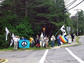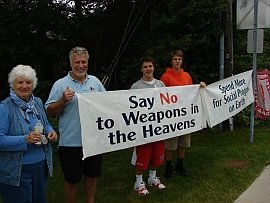 Following the vigil we had a supper at the Unitarian Church in Andover and heard speeches by John Schuchardt from the co-sponsoring North Shore Coalition for Peace & Justice. Art Brien also spoke and received a standing ovation from those in attendance. Local activist Mary Kate Small sang peace songs and then GN board member Loring Wirbel from Colorado Springs gave us more information about Raytheon’s key role in moving the arms race into space.