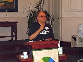 One dinner time highlight was the story telling by John Stewart (Florida) who did his comedic rendition of the time in 1997 when he and I and a few others from the Florida Coalition for Peace & Justice led the CBS-TV 60 Minutes film crew and NASA security around the Kennedy Space Center tourist facility as we protested the deadly launch of 72 pounds of plutonium-238 on the Cassini space mission. People loved John’s bit.