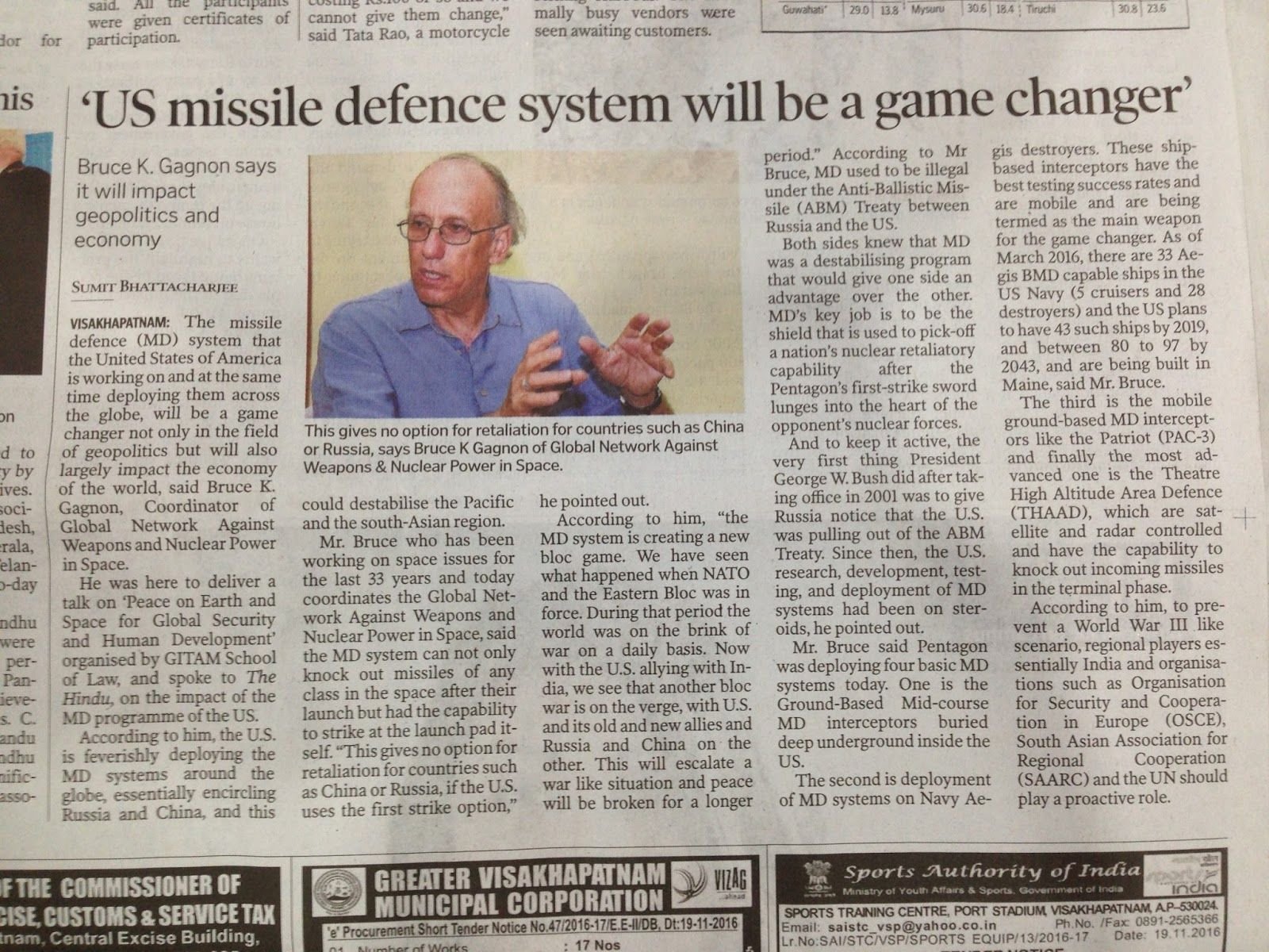 Sunday, November 20 2016Global Network Business Meeting Present: Dave, Bruce, Will, Atsushi, Rao, Sung-Hee There were only two items on the agenda really: 1. Thanks to Rao for the tremendous job he has done on organising the conference, speaking tour and generally getting more people and organisations involved in the GN from India and Nepal. 2. We agreed to propose that the 2017 GN annual space organizing conference (our 25th) be held on April 7-9 in Huntsville, Alabama. We’ have not held a GN event in the US for several years and Huntsville is the home of the Redstone Arsenal and the Space Command’s directorate for ‘missile defense’. Huntsville is called the ‘Pentagon of the south’ and is the manufacturing site for the PAC-3, SM-3 MD systems. In addition, THAAD is built in another part of Alabama. Redstone Arsenal was the place where the German rocket scientists were taken to after WW II to help create the US space program. The GN has held a meeting in Huntsville before - in 2001. It was agreed that we would seek approval from GN board members to go forward with planning for this event. We’d like to offer co-sponsorships to various other peace groups and Bruce Gagnon, Will Griffin and Dave Webb will form the initial organizing committee.
